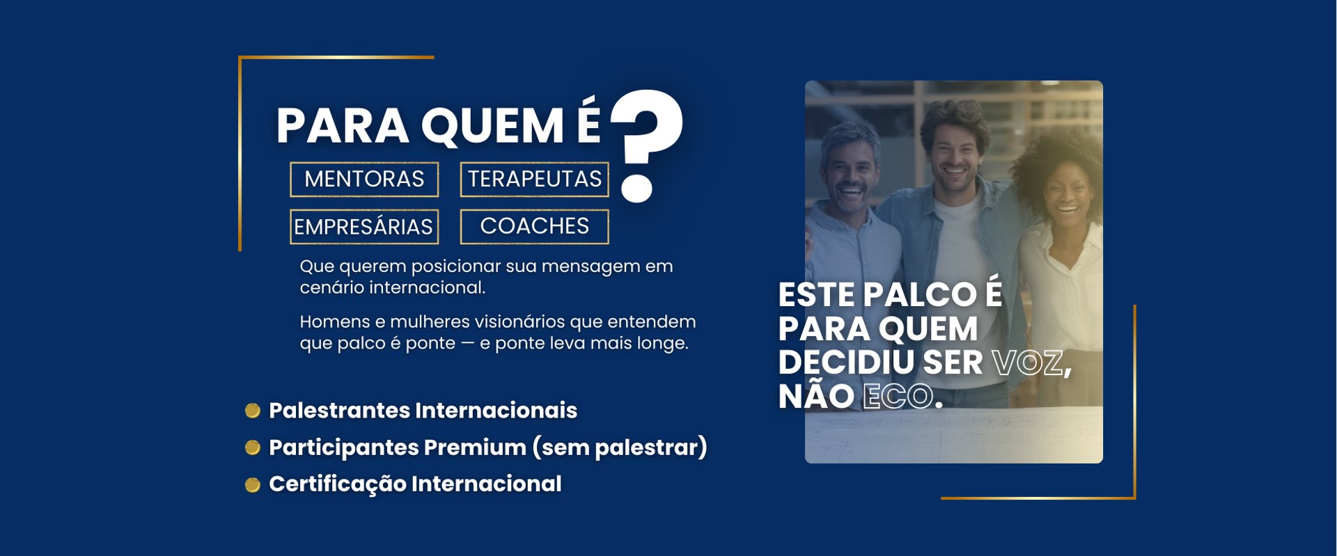 • Palestras e Eventos — Experiências presenciais e internacionais que unem emoção e liderança.